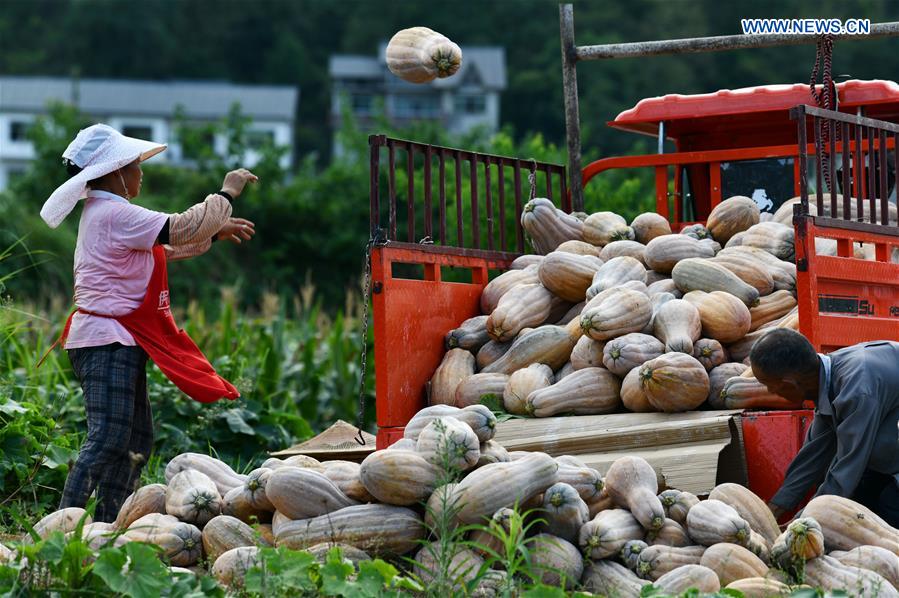 Agricultores estavam ocupados na colheita de abóboras em um campo do distrito de Sinan, na cidade de Tongren, província de Guizhou, no dia 12 de agosto de 2020. Nos últimos anos, o local encontrou um novo modo de desenvolver a agricultura, desempenhando o papel de empresas orientadas, cooperativas e agricultores. Essa forma ajudou os aldeões a aumentarem sua renda.