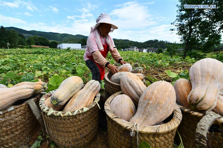 Agricultores estavam ocupados na colheita de abóboras em um campo do distrito de Sinan, na cidade de Tongren, província de Guizhou, no dia 12 de agosto de 2020. Nos últimos anos, o local encontrou um novo modo de desenvolver a agricultura, desempenhando o papel de empresas orientadas, cooperativas e agricultores. Essa forma ajudou os aldeões a aumentarem sua renda.