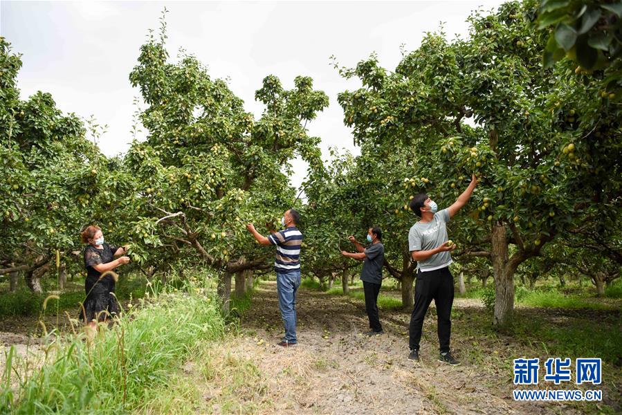 Um agricultor verifica o crescimento de peras perfumadas na Aldeia Awat em Korla, na Região Autônoma Uigur de Xinjiang, noroeste da China. Cobrindo uma área de 455 mil mu (cerca de 30.333 hectares), o cultivo de pereiras deve render mais de 500 mil toneladas de peras perfumadas na cidade de Korla este ano. Até o momento, Korla recebeu encomendas de 121.300 toneladas de peras.