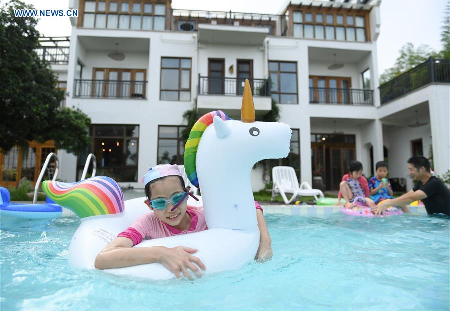 Turistas aproveitam as férias em uma casa de família na vila de Fangshan, da cidade de Huzhou, província de Zhejiang, leste da China, no dia 27 de agosto de 2020. Aproveitando os recursos ecológicos, os moradores da vila aumentaram sua renda desenvolvendo a indústria de hospedagem domiciliar.