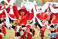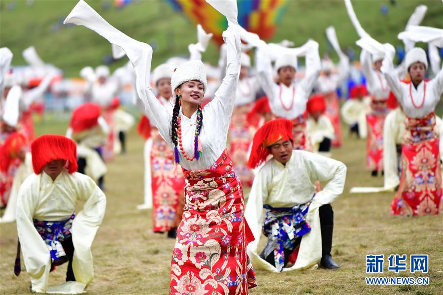 Pessoas dançam durante a cerimônia de abertura do 20º Festival de Turismo de Shambhala na Prefeitura Autônoma do Tibete de Gannan, no noroeste da Província de Gansu da China, em 31 de agosto de 2020.