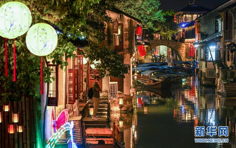 Antiga vila de Zhouzhuang recebe decorações para celebrar o Festival da Lua e o Dia Nacional