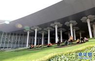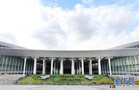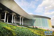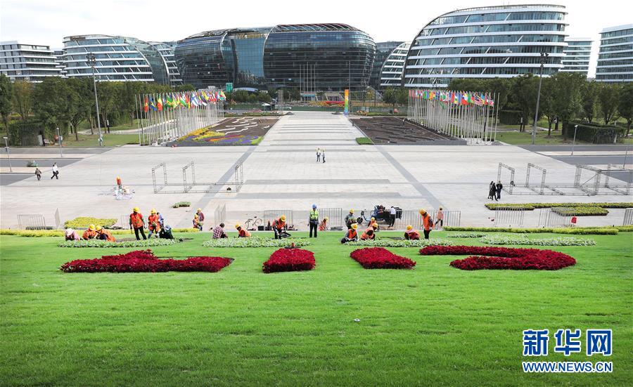 Jardineiros preparam decorações de flores para a 3ª Expo Internacional de Importação da China