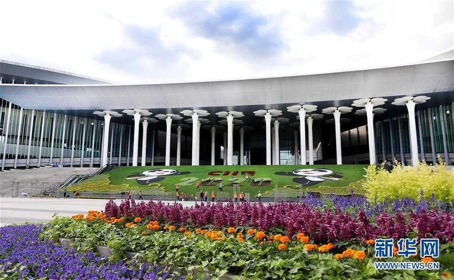 Jardineiros preparam decorações de flores para a 3ª Expo Internacional de Importação da China