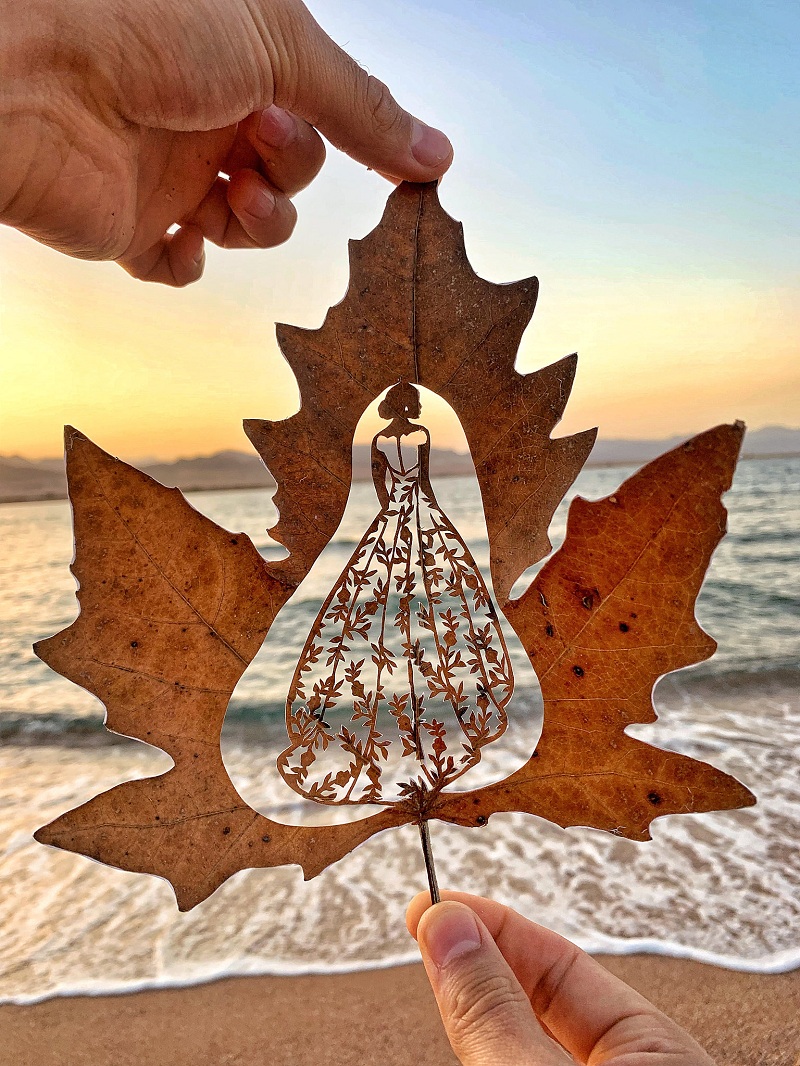 Artista Kanat Nurtazin cria obras de arte em folhas de árvores