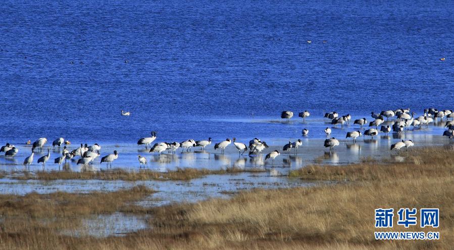 Guindastes de pescoço preto chegaram à zona de reserva natural de Dashanbao para passar o inverno