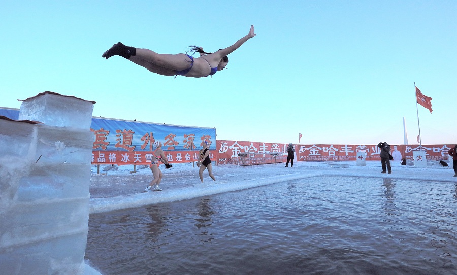 Entusiastas participam da natação de inverno em Harbin
