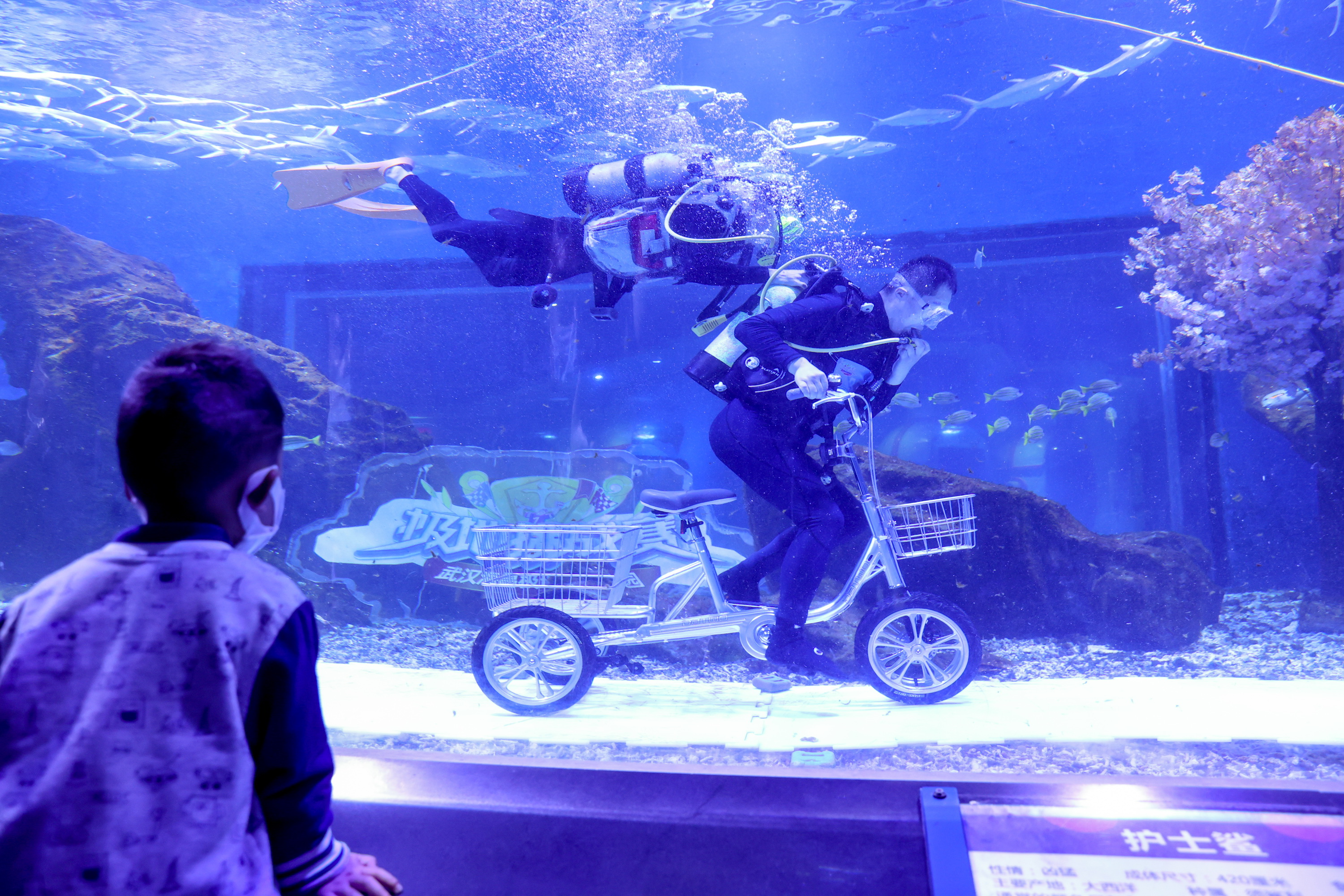 Quer experimentar um jogo de futebol ou andar de bicicleta debaixo d’água? O Parque Oceânico de Haichang de Wuhan organizou uma competição de esportes dentro da piscina, na qual os participantes podiam concorrer aos títulos de “melhor futebolista”, “melhor ciclista” e “campeão de beber cerveja”. Em qual categoria você acha que ganharia?