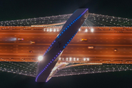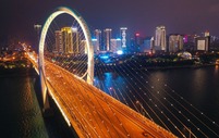 Paisagem noturna da ponte Baisha em Liuzhou, na Região Autônoma da Etnia Zhuang de Guangxi. Esta é a ponte estaiada maior e mais extensa antissimétrica no mundo.