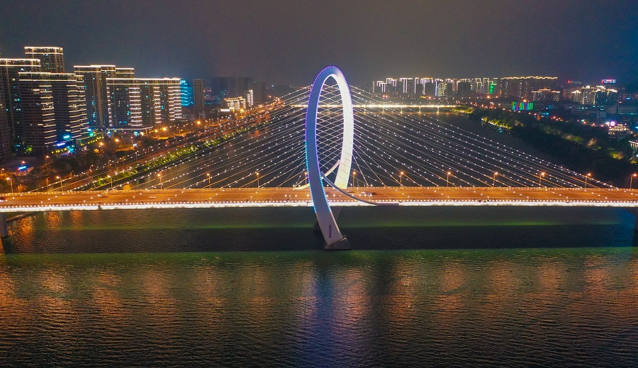 Paisagem noturna da ponte Baisha em Liuzhou, na Região Autônoma da Etnia Zhuang de Guangxi. Esta é a ponte estaiada maior e mais extensa antissimétrica no mundo.
