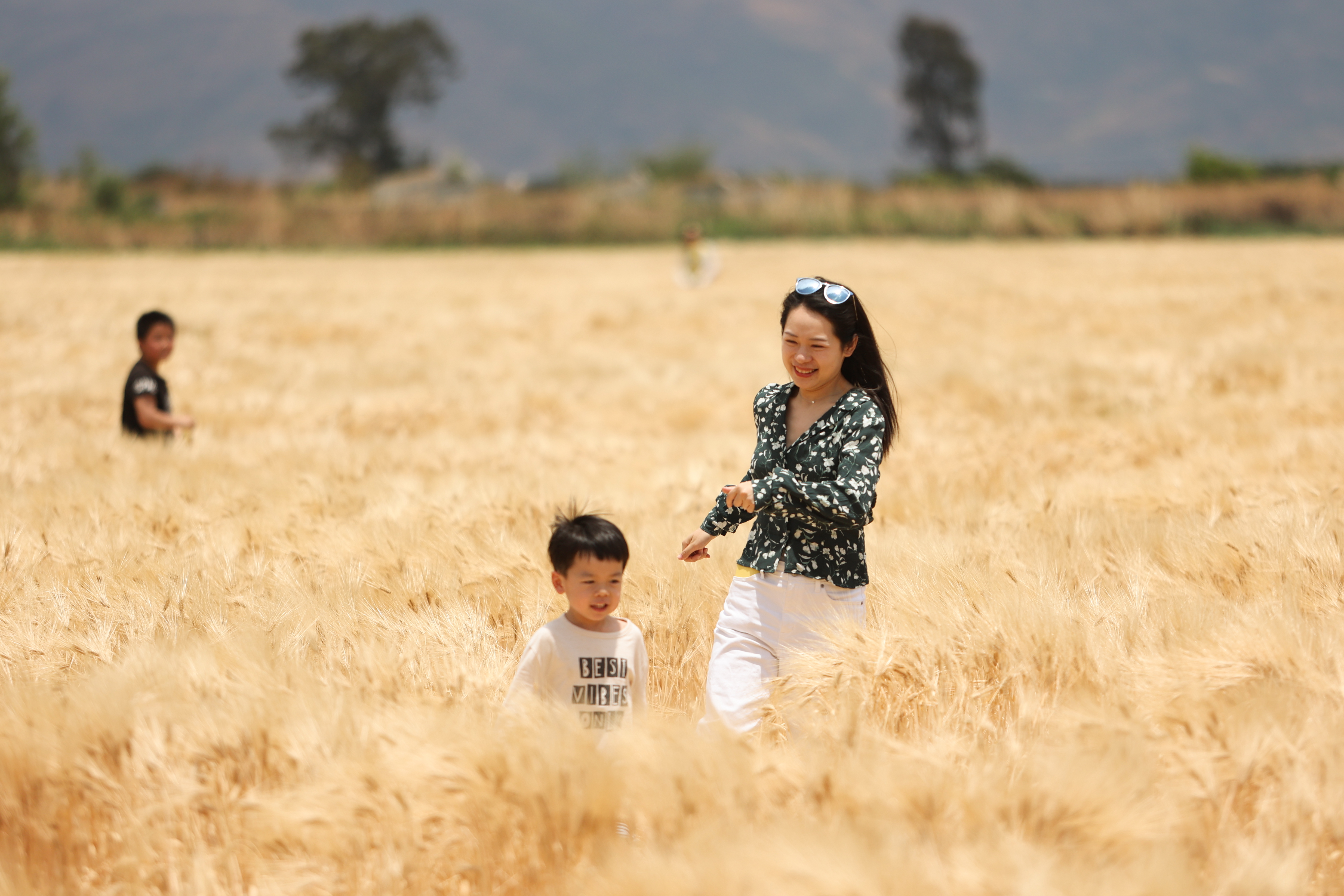 Visitantes tiram fotos no campo de trigo dourado na cidade de Dali