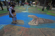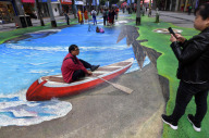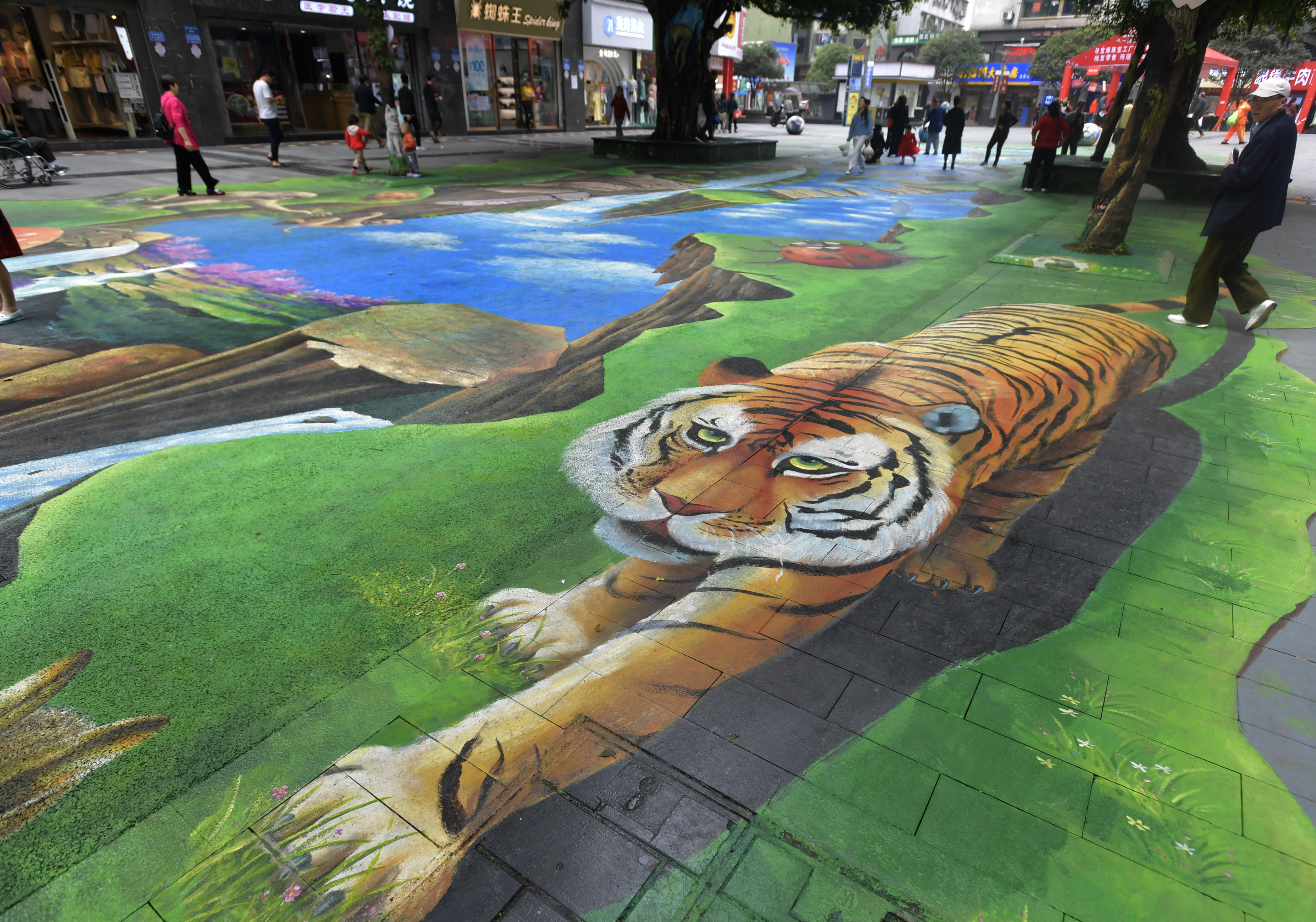 Localizado em uma rua comercial na cidade de Chongqing, o grafite no chão com efeito 3D atrai muitos turistas.