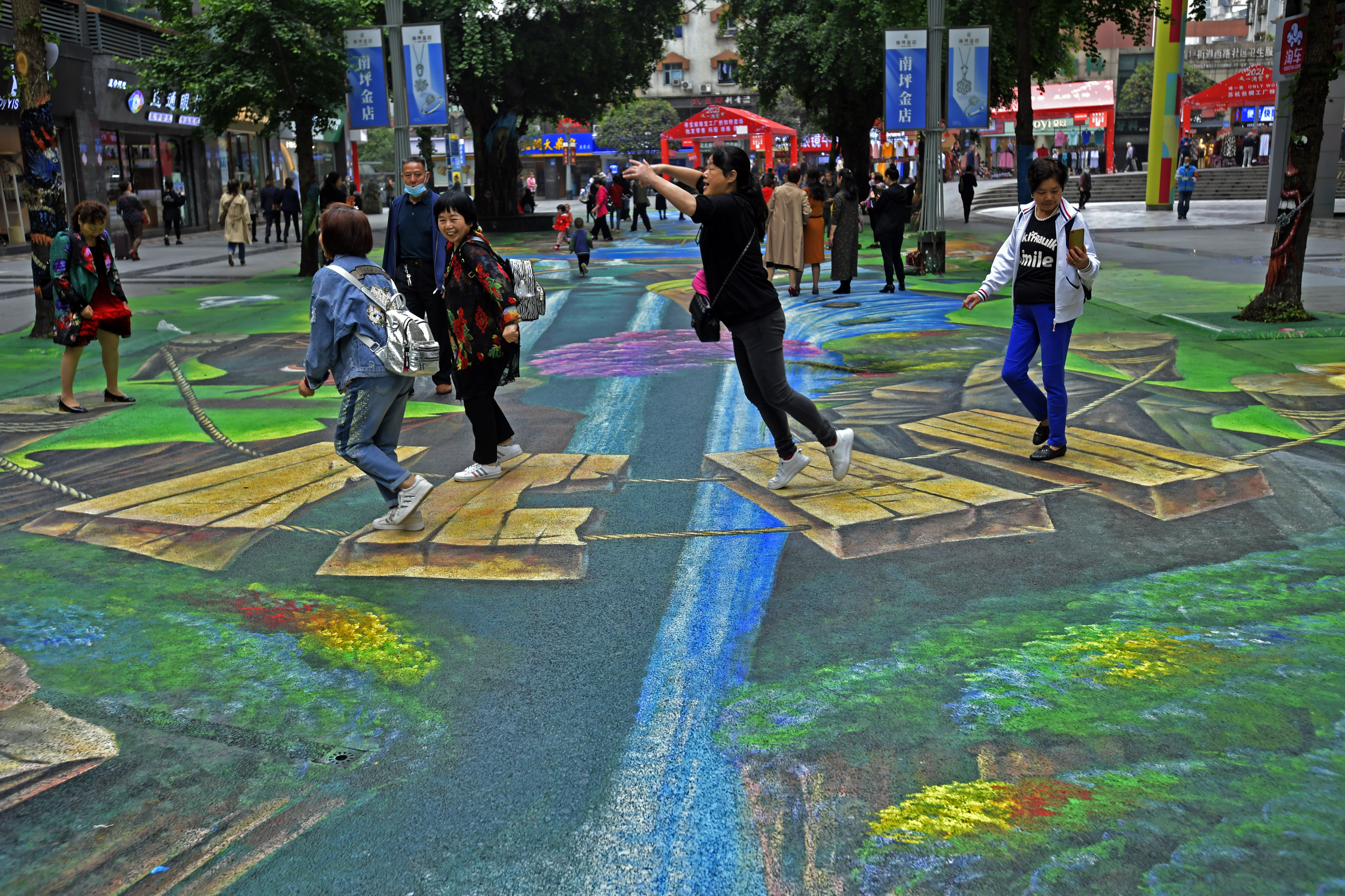Localizado em uma rua comercial na cidade de Chongqing, o grafite no chão com efeito 3D atrai muitos turistas.