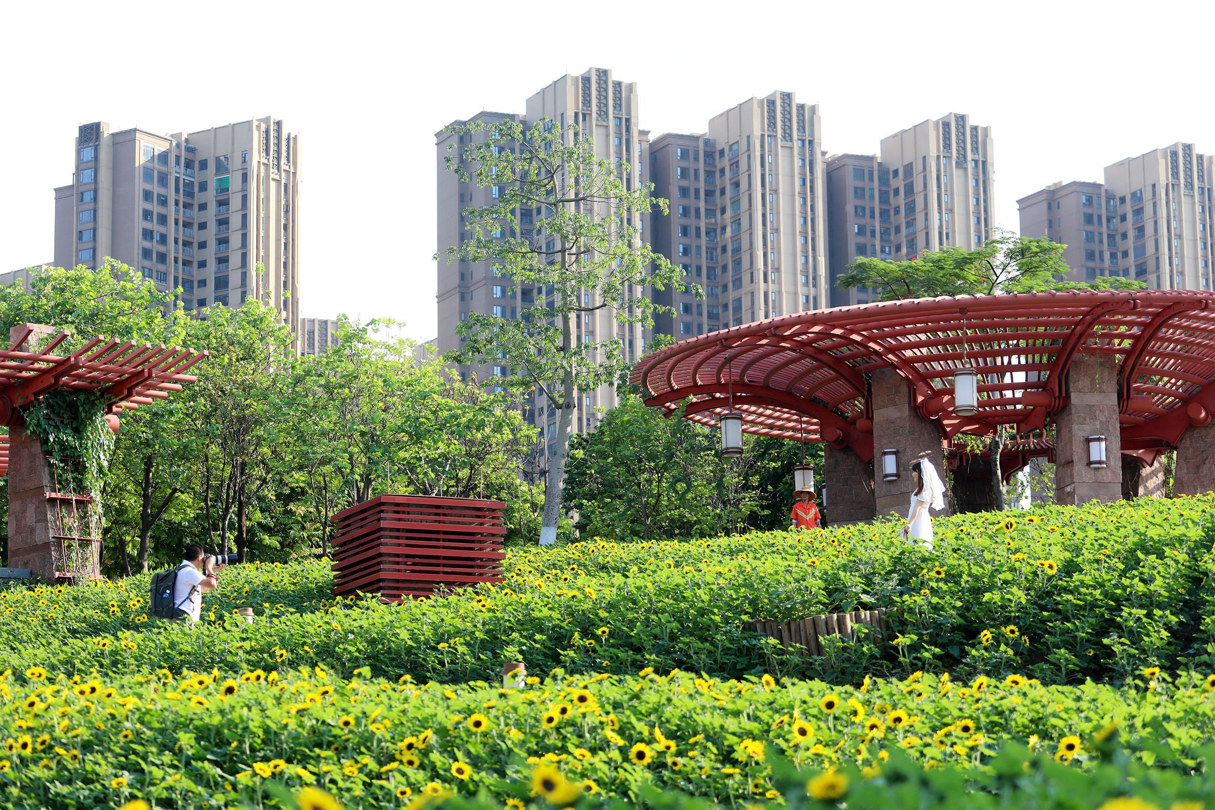 Turistas caminham em um campo de girassol em Foshan, província de Guangdong.