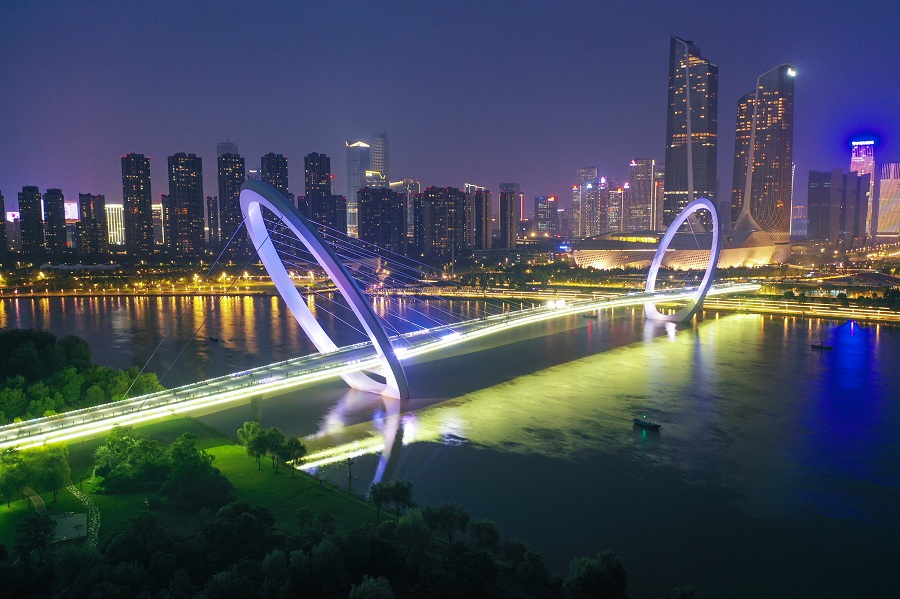 Vista noturna da ponte pedestre, conhecida pelos locais como “olho de Nanjing”.