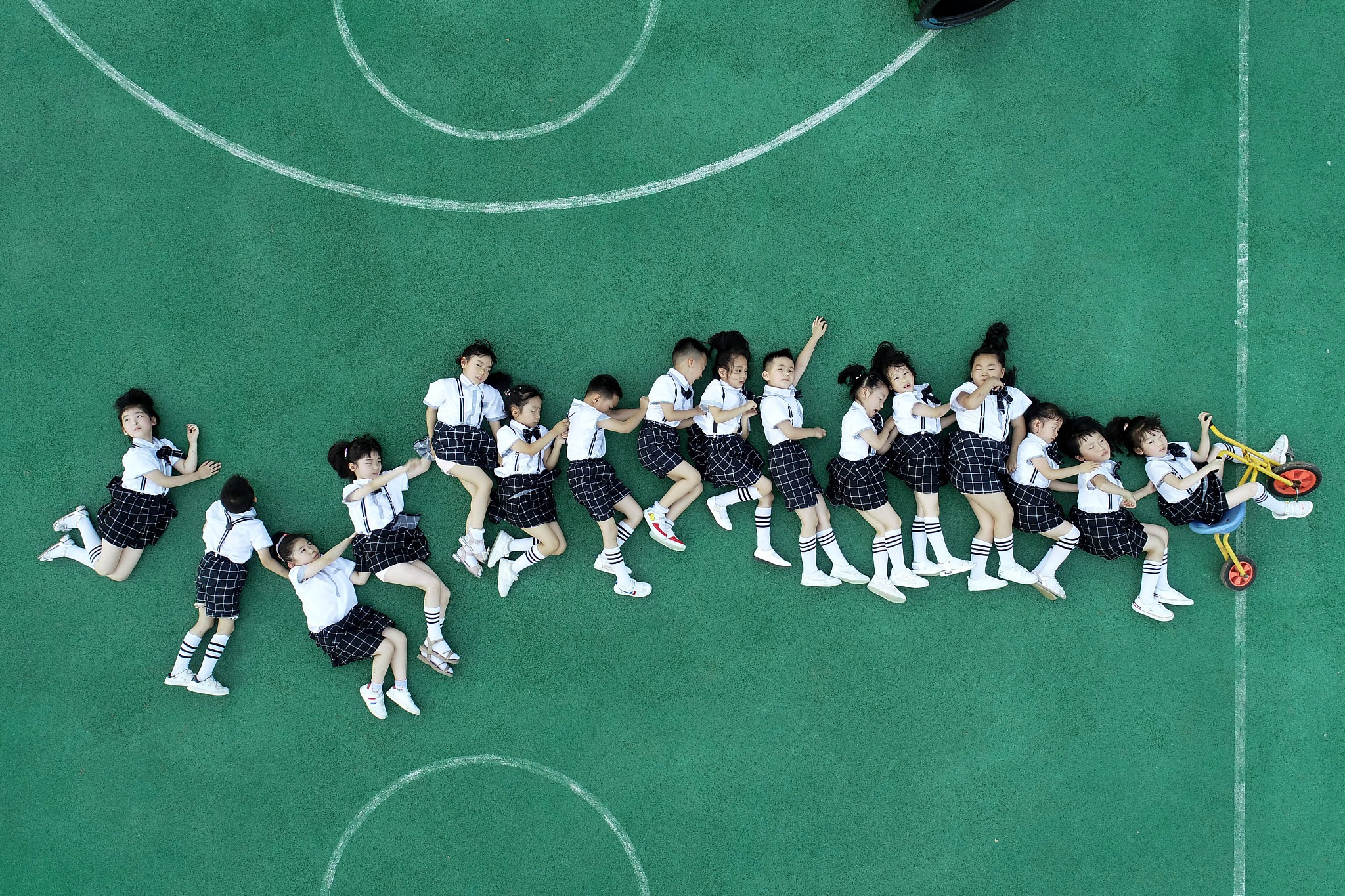 Crianças do jardim de infância na cidade de Fuzhou, na província de Jiangxi, posam para sua primeira foto de graduação. Eles vão sair do jardim de infância em julho e entrar na escola primária em setembro.