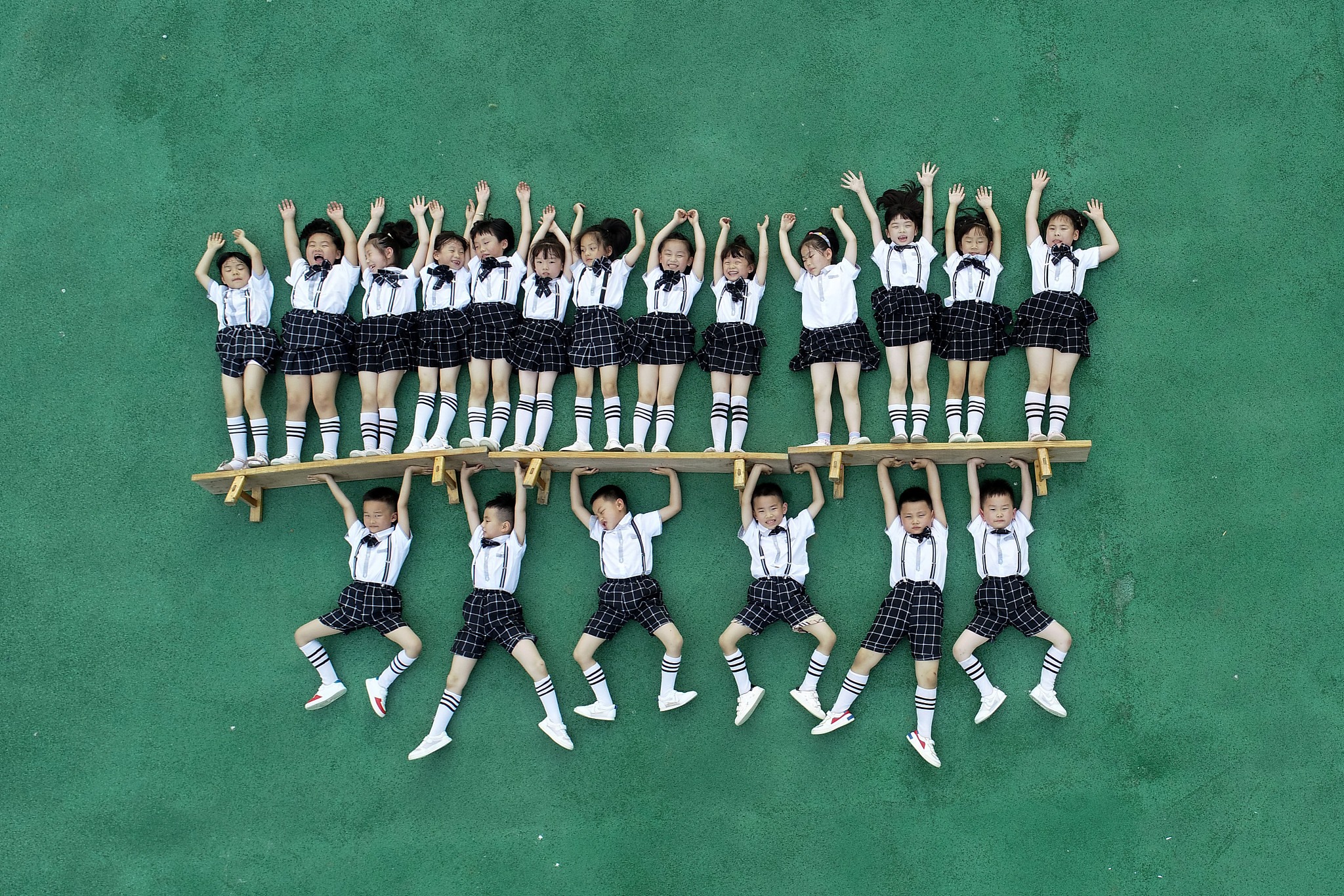 Crianças do jardim de infância na cidade de Fuzhou, na província de Jiangxi, posam para sua primeira foto de graduação. Eles vão sair do jardim de infância em julho e entrar na escola primária em setembro.