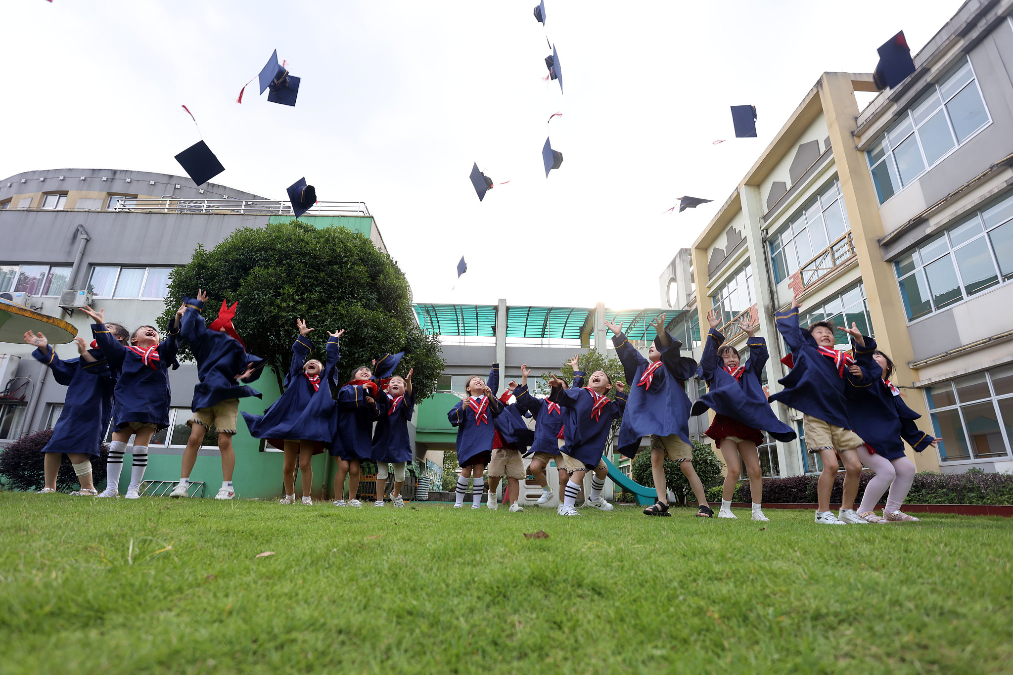 Crianças do jardim de infância na cidade de Fuzhou, na província de Jiangxi, posam para sua primeira foto de graduação. Eles vão sair do jardim de infância em julho e entrar na escola primária em setembro.