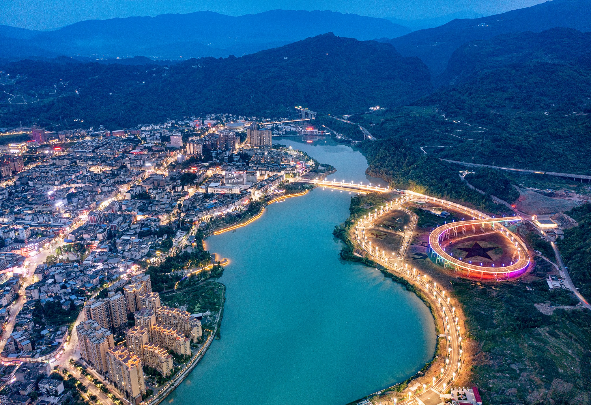 O distrito montanhoso de Tianquan, na cidade de Ya’an, província de Sichuan, possui noites bem iluminadas com as luzes acesas ao longo das ruas nas margens do lago Cilang, formando uma cena espetacular.