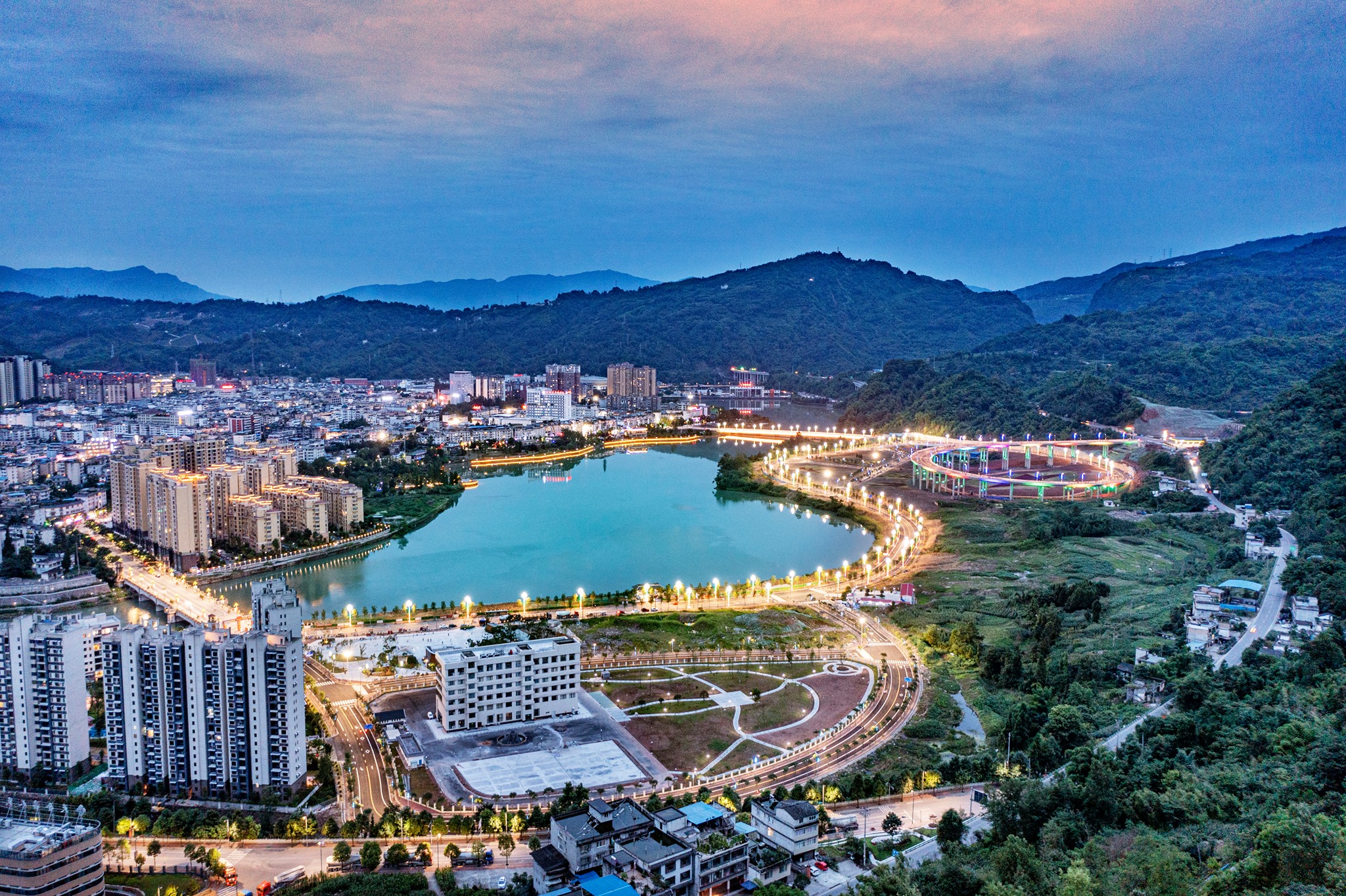 O distrito montanhoso de Tianquan, na cidade de Ya’an, província de Sichuan, possui noites bem iluminadas com as luzes acesas ao longo das ruas nas margens do lago Cilang, formando uma cena espetacular.