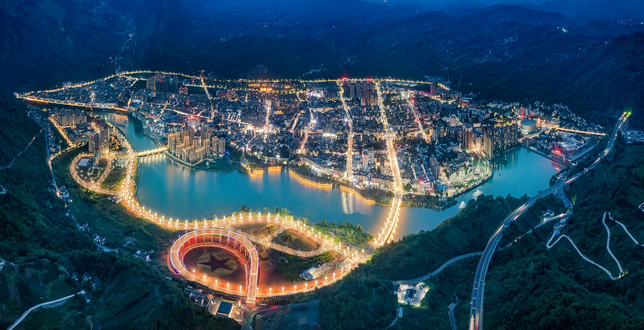O distrito montanhoso de Tianquan, na cidade de Ya’an, província de Sichuan, possui noites bem iluminadas com as luzes acesas ao longo das ruas nas margens do lago Cilang, formando uma cena espetacular.