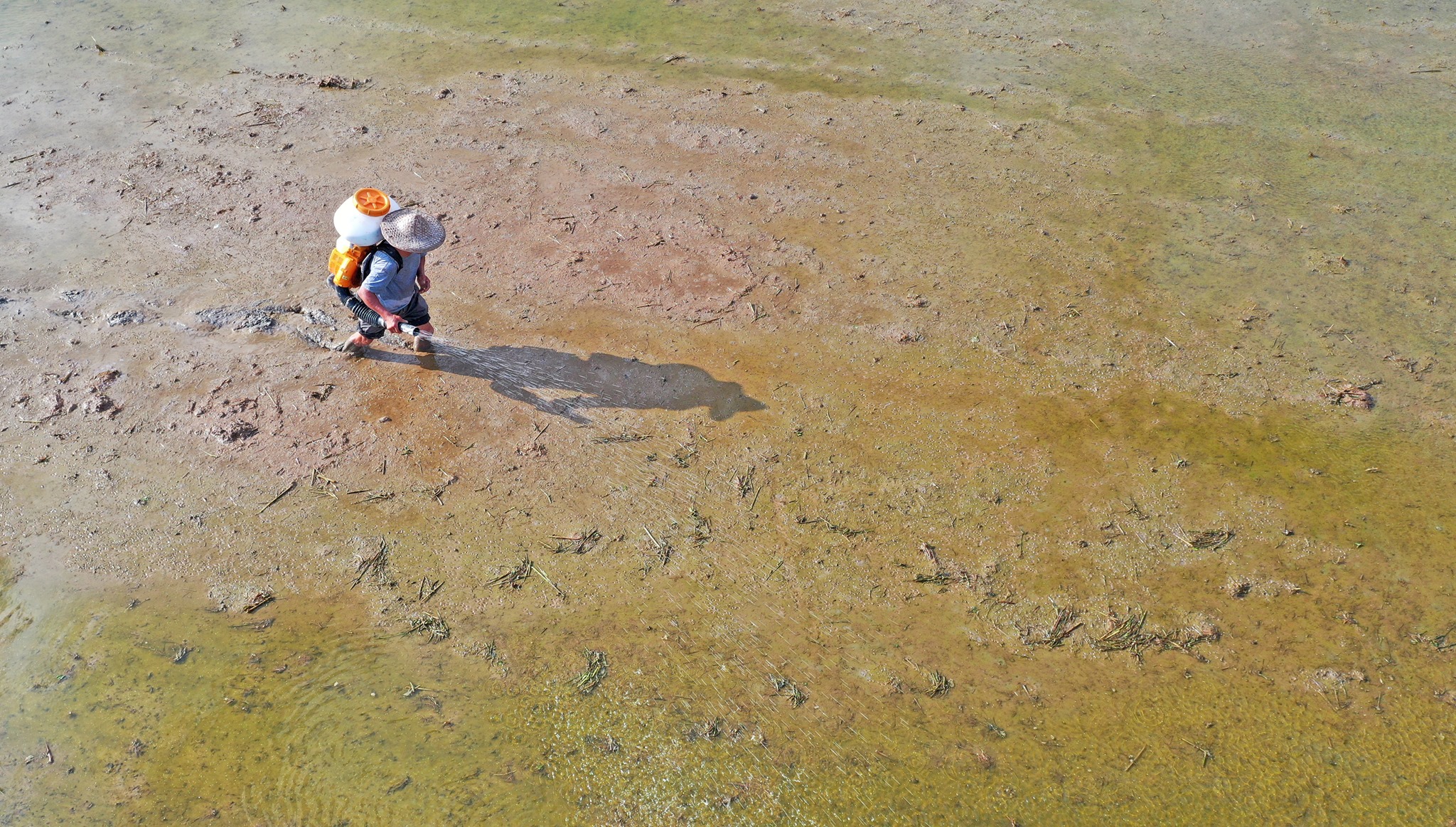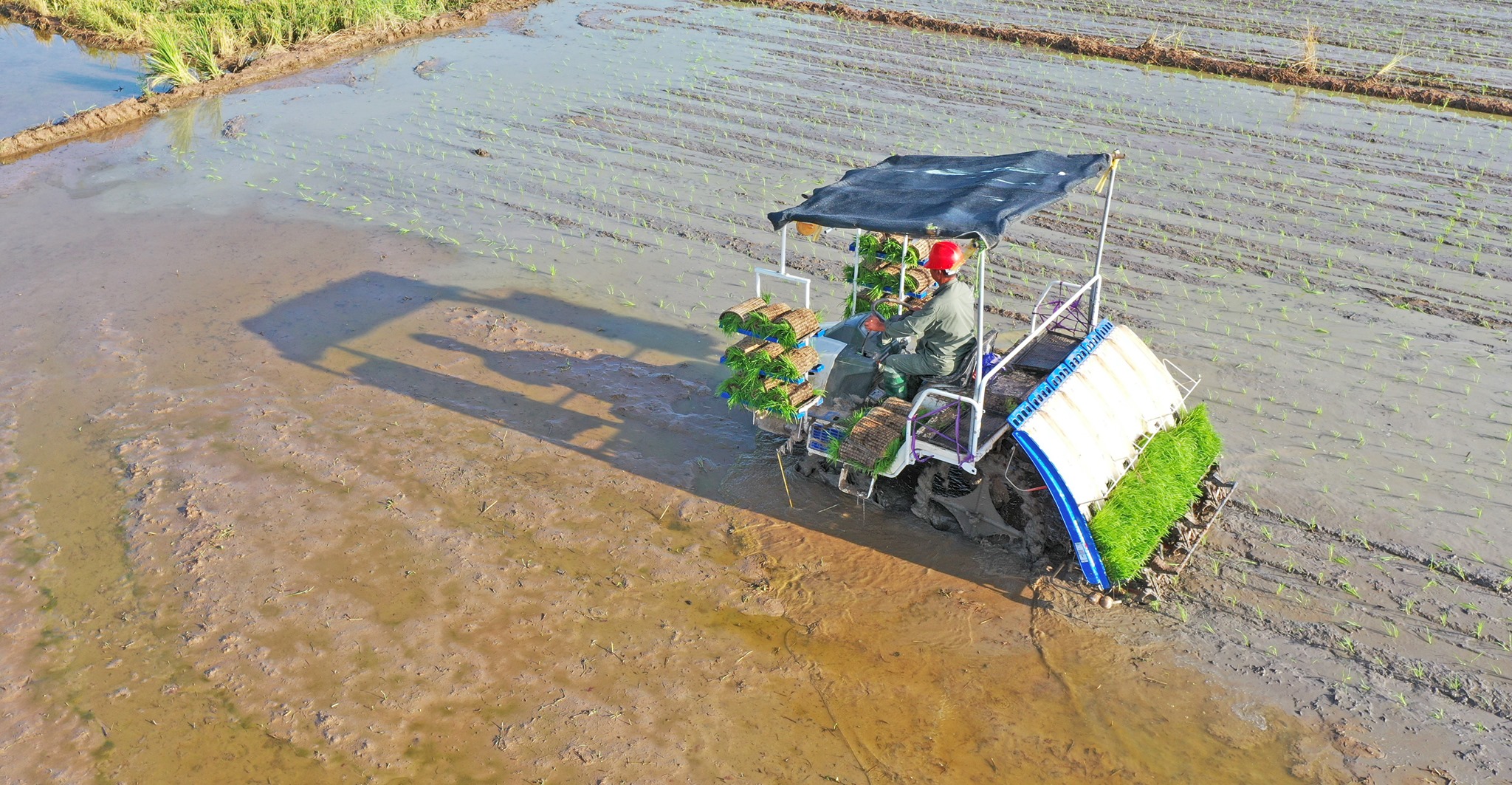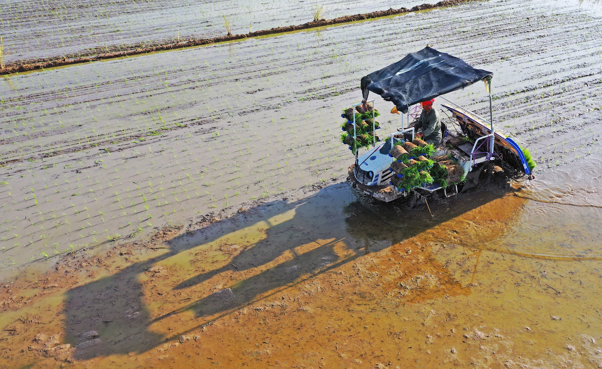 Agricultores estão ocupados no plantio de arroz em campos aráveis de alto padrão no distrito de Xianju, da província de Zhejiang. O dia 22 de julho marca a estação Calor Intenso, um dos 24 períodos climáticos da China, época de crescimento rápido das plantas.