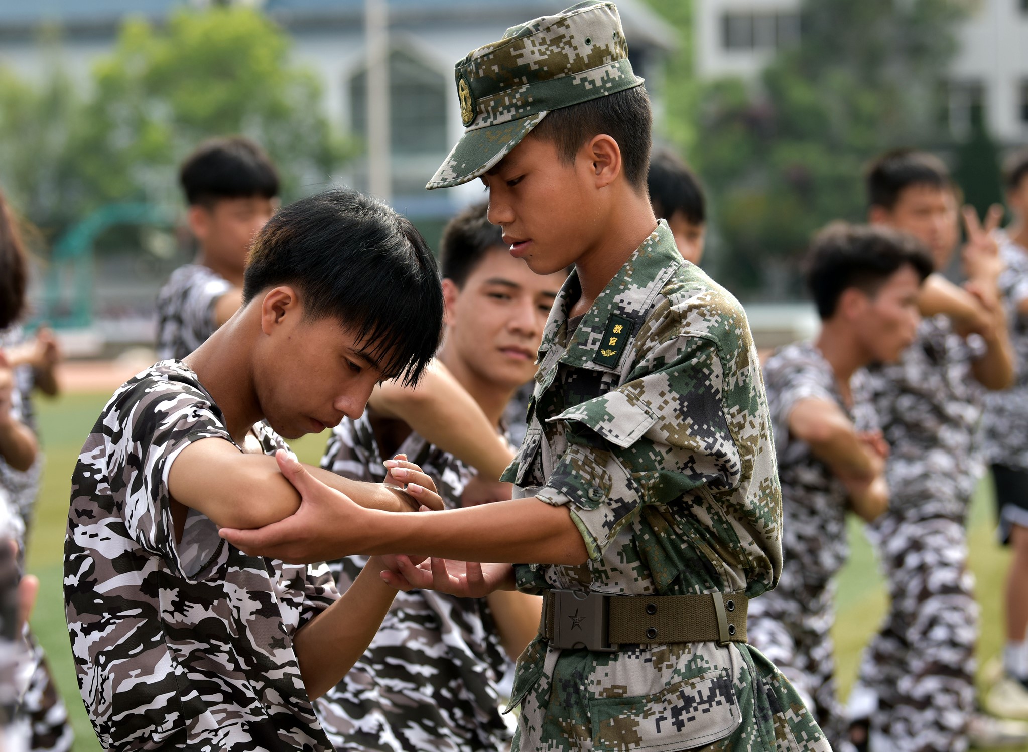 Estudantes novatos de uma escola profissionalizante no distrito de Congjiang, na província de Guizhou, começaram nesta terça-feira (24) a receber uma semana de treinamentos militares antes do início do semestre de outono. Os exercícios, que incluem posturas, filas, passos e boxe esportivo militar, tem como objetivo elevar a qualidade física e espiritual, formar bons costumes cotidianos e reforçar a colaboração em equipe dos alunos.