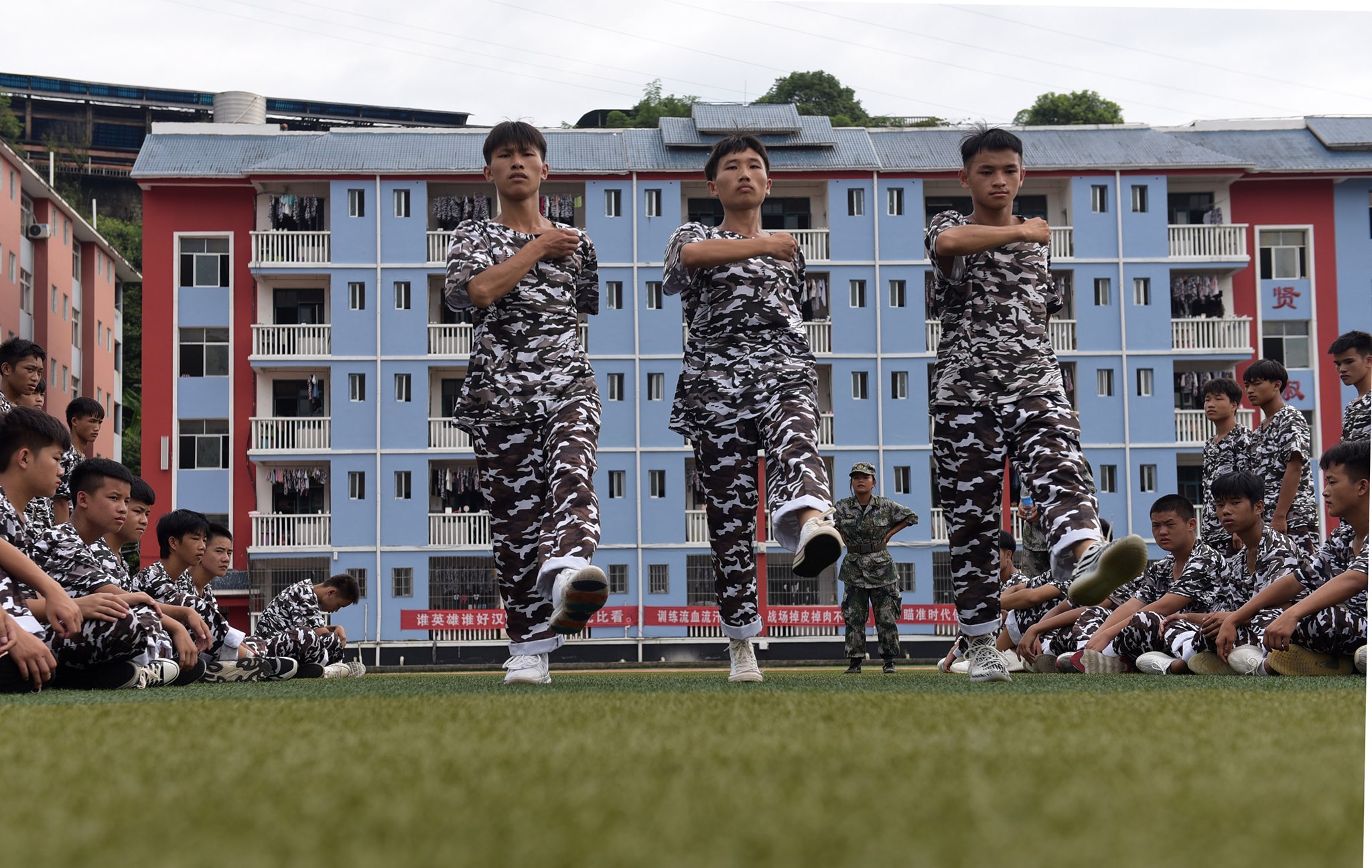 Estudantes novatos de uma escola profissionalizante no distrito de Congjiang, na província de Guizhou, começaram nesta terça-feira (24) a receber uma semana de treinamentos militares antes do início do semestre de outono. Os exercícios, que incluem posturas, filas, passos e boxe esportivo militar, tem como objetivo elevar a qualidade física e espiritual, formar bons costumes cotidianos e reforçar a colaboração em equipe dos alunos.