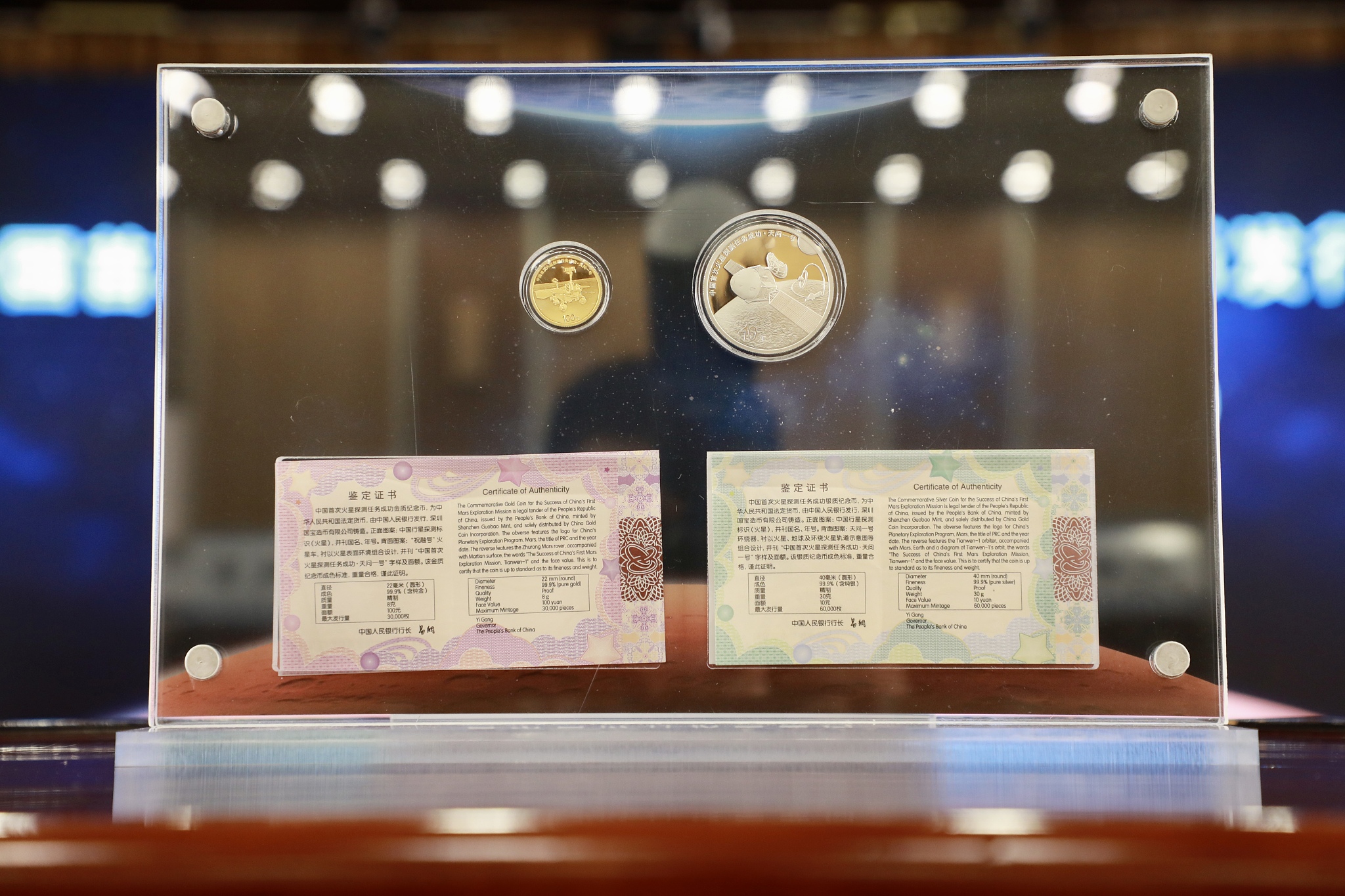 O Banco Popular da China lançou no dia 30 um conjunto de moedas de ouro e prata para comemorar o sucesso da primeira missão de exploração da China em Marte.