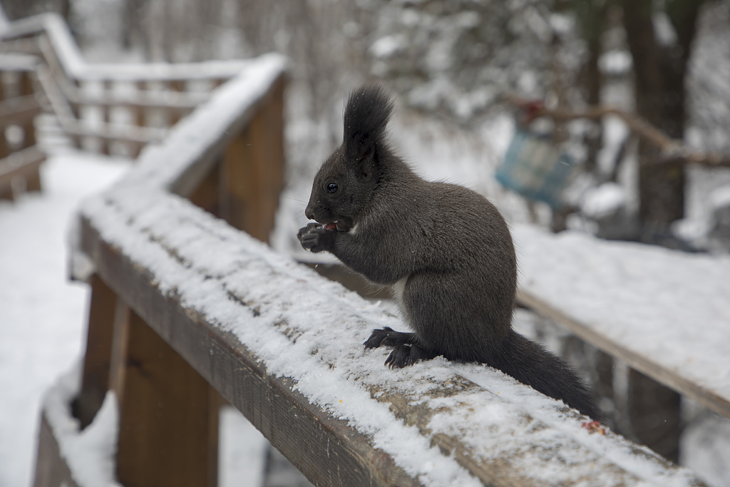 No dia 9, uma neve pesada caiu em Jilin, no norte da China. Alguns cidadãos levaram amendoins e avelãs para os parques para alimentar os esquilos.