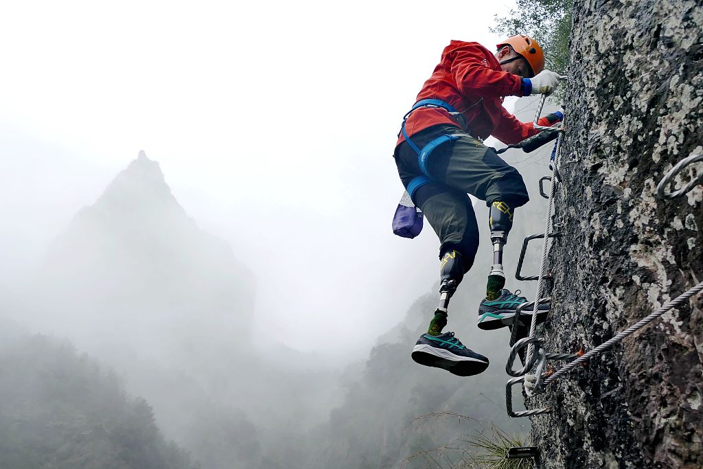 Atleta chinês paralímpico sênior realiza seu sonho de montanhista