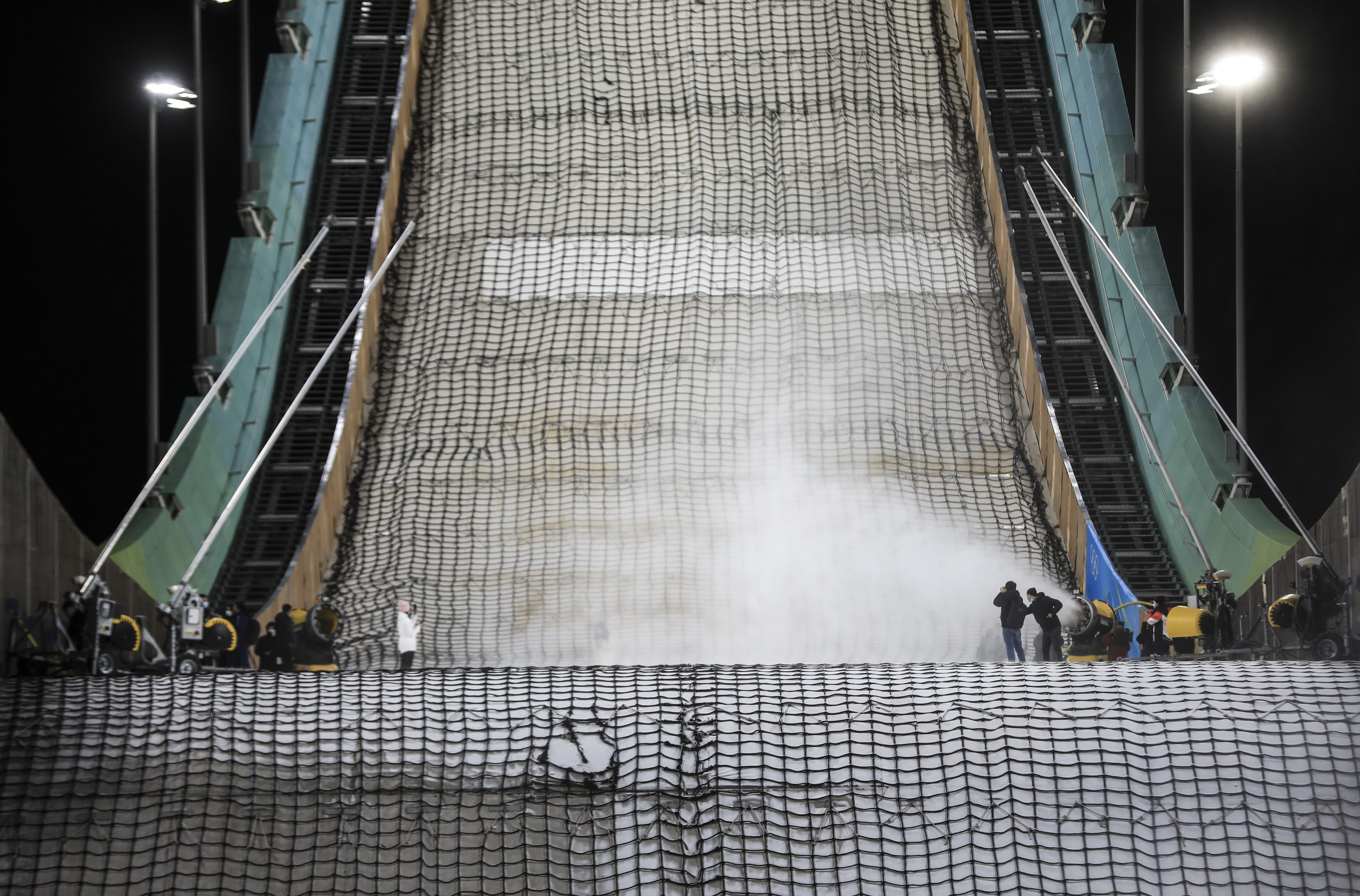 Trabalhadores fazem neve artificial na Plataforma de Salto de Esqui em Beijing