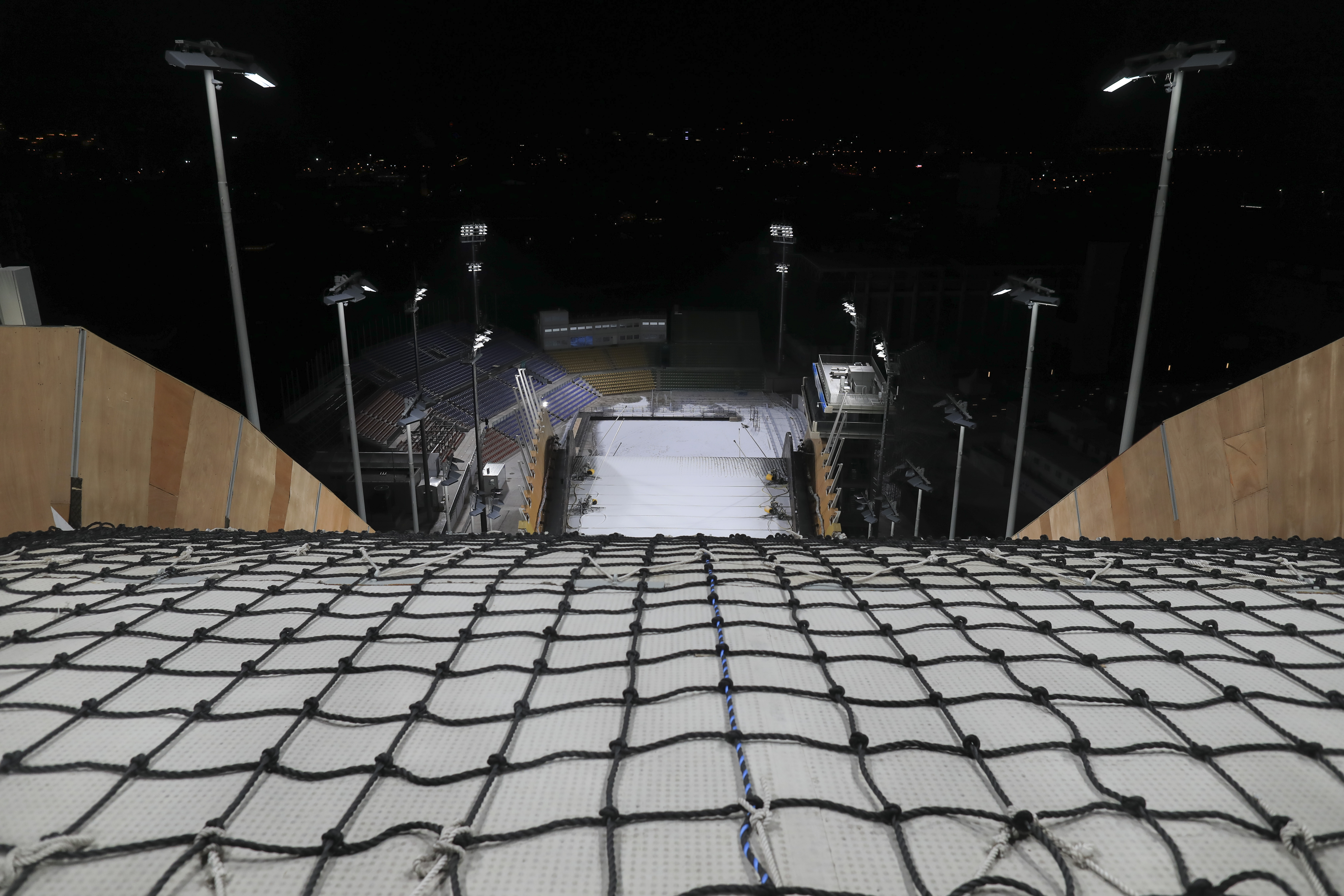 Trabalhadores fazem neve artificial na Plataforma de Salto de Esqui em Beijing