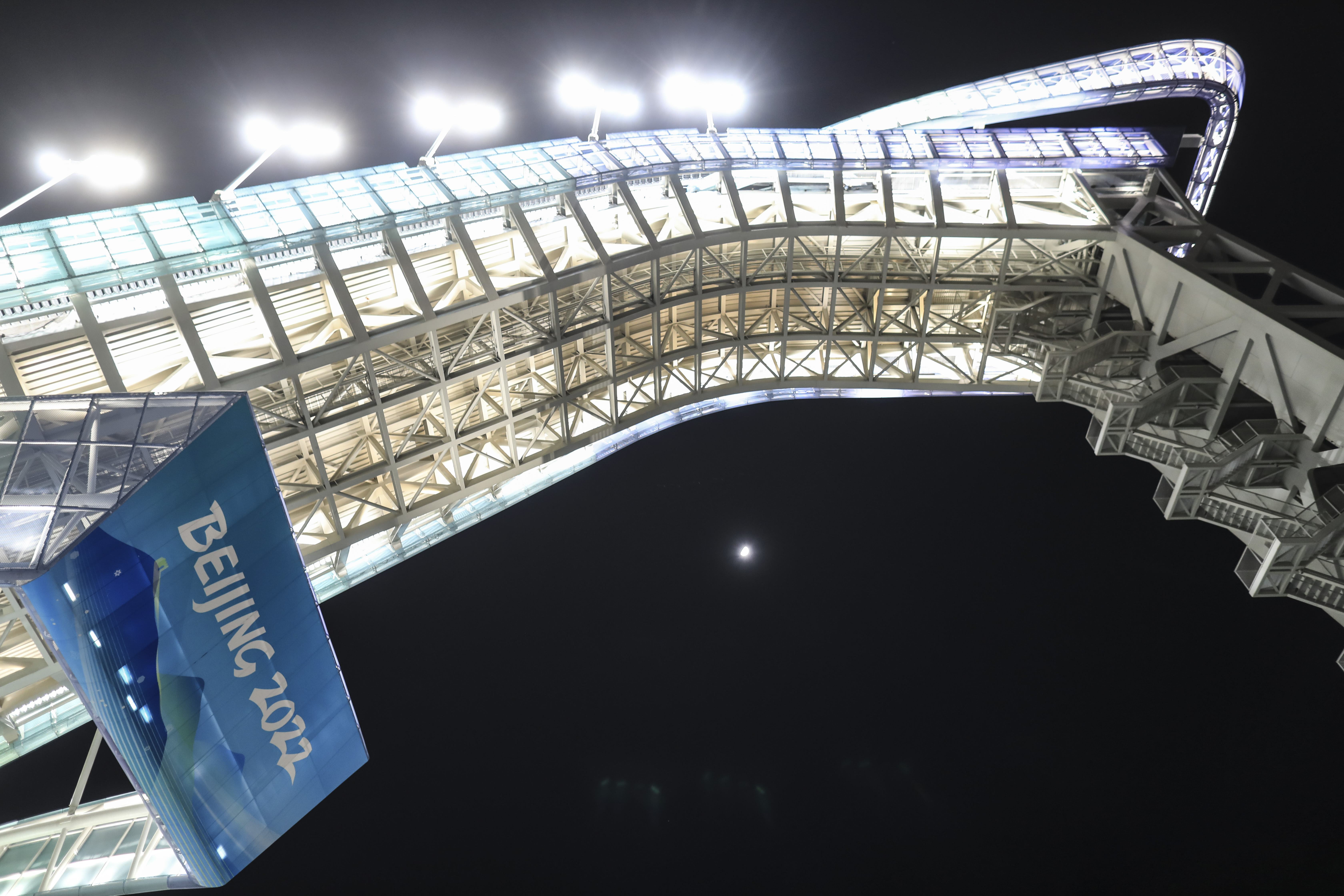 Trabalhadores fazem neve artificial na Plataforma de Salto de Esqui em Beijing