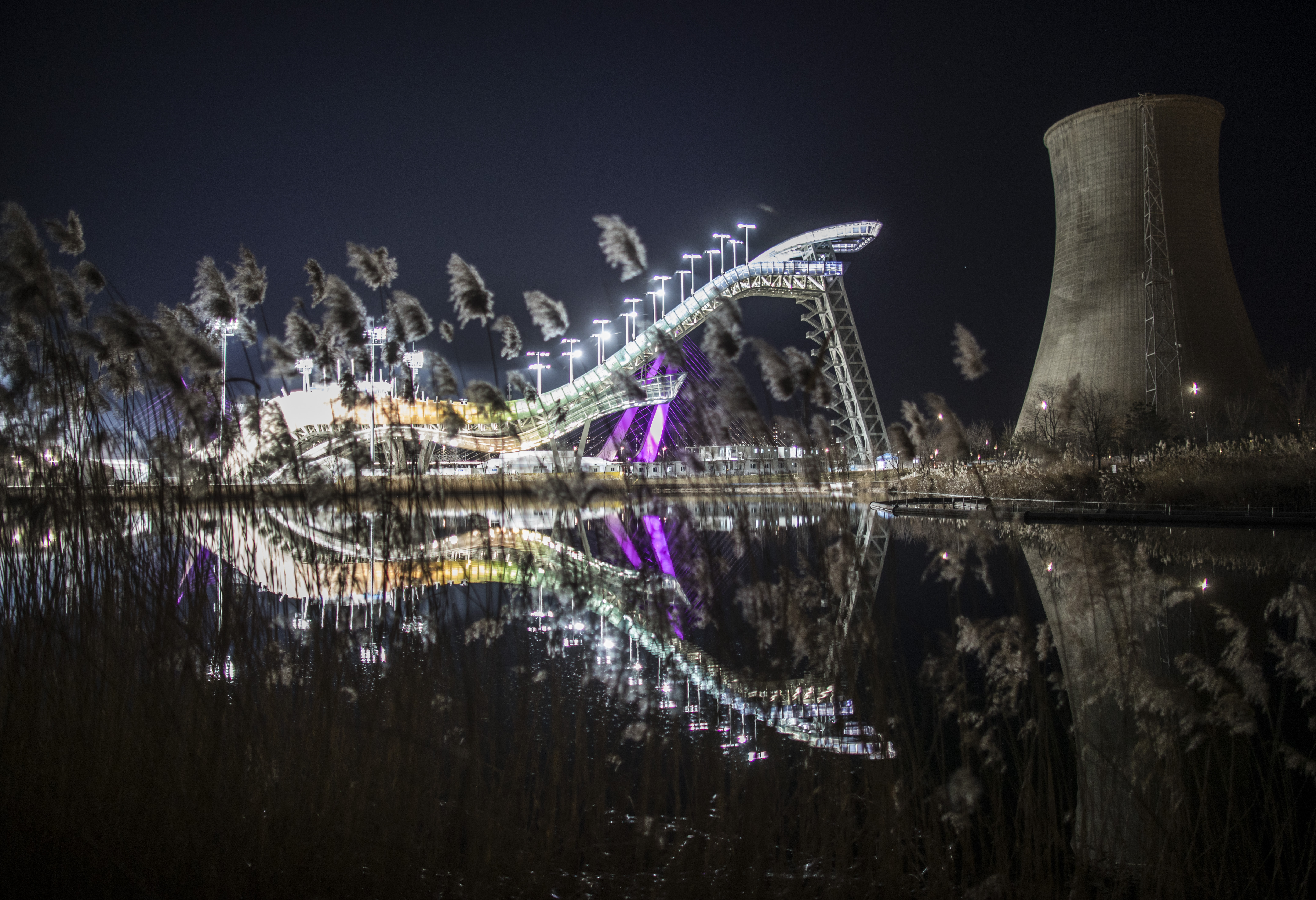 Trabalhadores fazem neve artificial na Plataforma de Salto de Esqui em Beijing