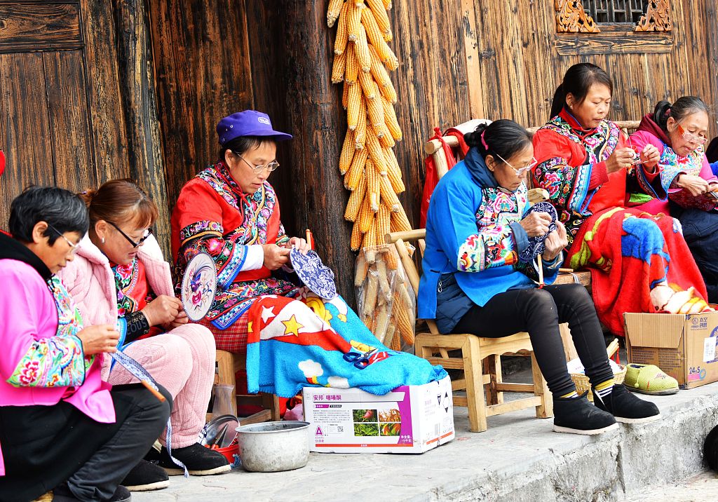 Durante o inverno, as moradoras da vila Huatian da etnia Miao, em Chongqing, sempre ficam entediadas em casa por terem pouco trabalho no campo e menos turistas na vila. Este ano, o governo local estabeleceu uma oficina de bordado de estilo Miao para quem quiser aprender a técnica local. Os artesanatos que as mulheres fazem, tais como leques e pinturas de bordado, podem ser vendidos na loja de comércio eletrônico criada pelo governo local. Com isso, elas conseguem uma renda extra no tempo livre, e essa é também uma boa maneira para divulgar a cultura tradicional de bordados da etnia Miao.
