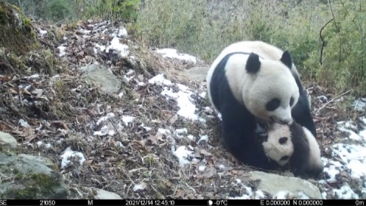 Câmaras com sensor infravermelho gravam panda gigante com filhote