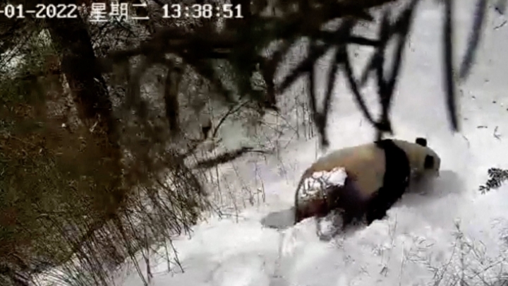 Pandas gigantes brincam na neve na reserva natural de Gansu