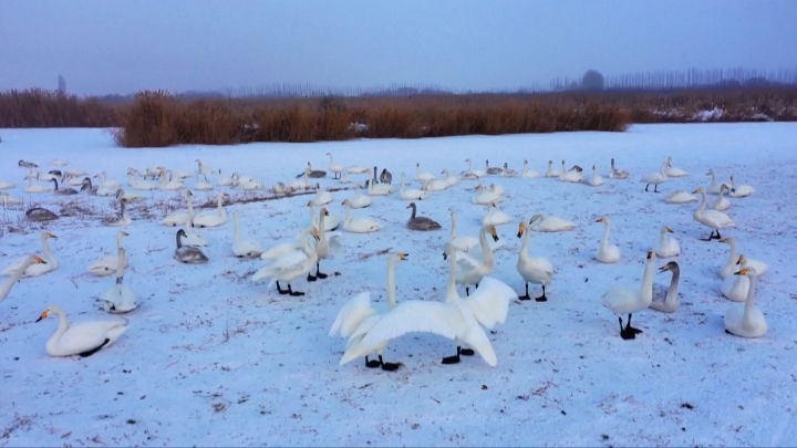 Cisnes-bravos passam inverno no Pantanal de Manas na China