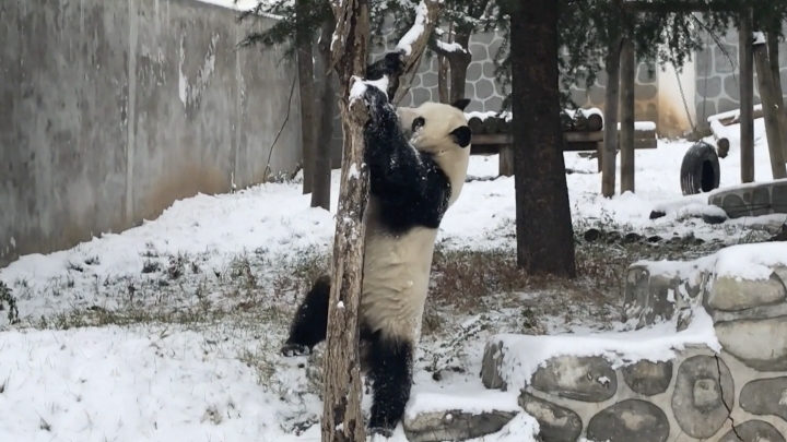 Pandas gigantes em Shaanxi desfrutam da alegria do gelo e da neve